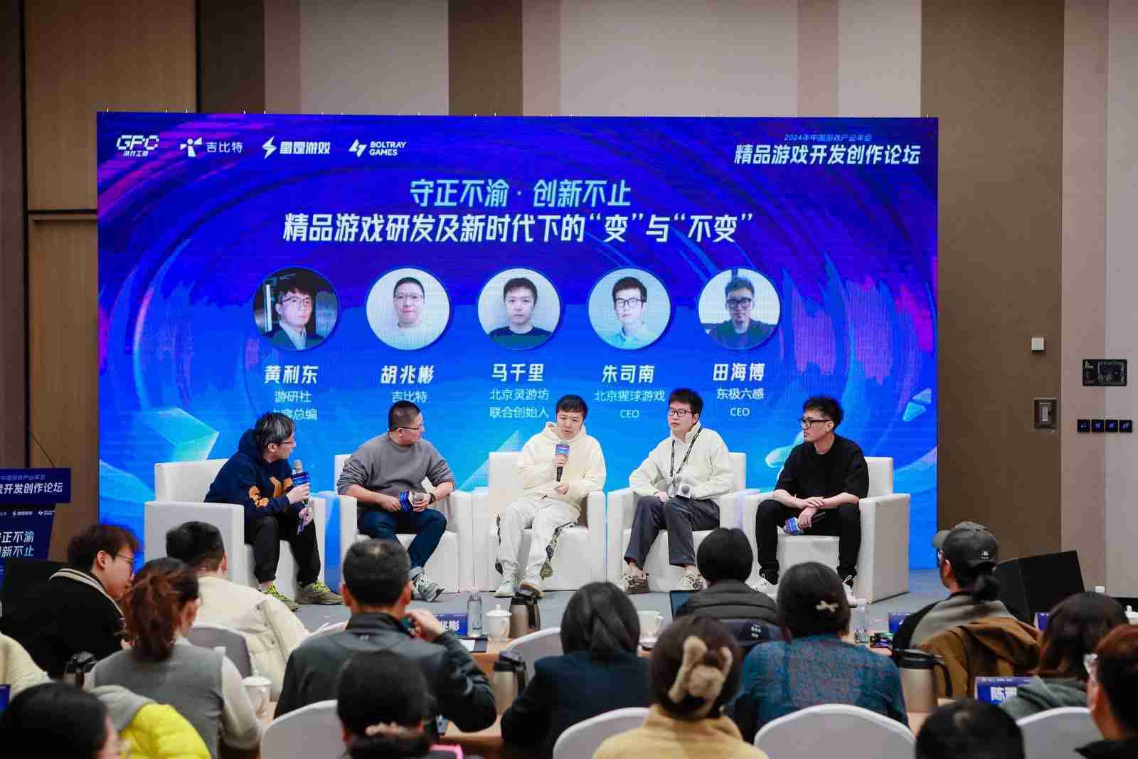 圆桌对话环节,,在游研社内容总编黄利东的主持下,,,1winCTO胡兆彬、、、、北京灵游坊联合创始人马千里、、、北京猩球游戏CEO朱司南、、、东极六感CEO田海博等四位嘉宾围绕“守正不渝、、、、创新不止——精品游戏研发及新时代下的‘变’与‘不变’”这一主题分享了各自在精品游戏开发理念及工程能力搭建方面的见解和经历,,,,并就行业变化下游戏人需要坚守的理念等展开交流探讨。。。。