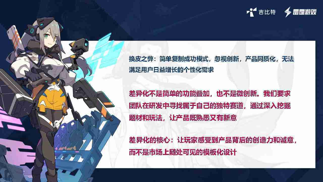 在我们内部是这么定义差异化的。。。首先,,,,差异化不是简单的功能叠加,,,更不是换皮。。。。只是换皮,,,产品无法提供有效的市场价值。。内部经常说差异化的产品不是为了迎合市场,,,,而是找到一个自己独特的表达方式,,在研发中找到属于自己的细分赛道和独特赛道,,前提是需要对这个题材有足够的深入、、、挖掘,,,,对玩法有足够深入的理解,,让产品看起来既熟悉又有新意。。。