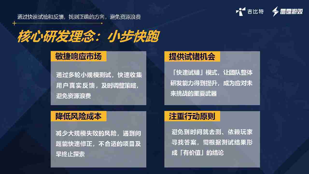 小步快跑不是找答案,,,,而是验证答案。。我们之前有项目是这样的,,有些制作人会有几个方向觉得都可以做,,但是不确定做哪一个,,,会选择几个都做,,,做完拿到市场跑,,,,跑出哪一个更好,,,,基于这个再做后续的研发和拓展。。。但这种情况最容易出现一个问题,,可能被玩家裹胁,,,,玩家说这个点不错、、、那个点不错,,到底听还是不听,,,,不听感觉是无视玩家的反馈,,,听的话,,可能自己没想清楚导致研发思路发生偏颇。。。所以针对这一点后面自己复盘整理,,,发现制作人自己心里要有数,,,,要做自己觉得好玩的,,,,而且明确知道这个东西是你想做的,,,然后拿到市场验证这个答案是不是对的,,,而不是拿一堆答案找哪一个答案更好。。。