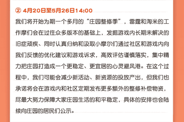 合作的结束并不意味着这个童年IP的结束,,,对于《摩尔庄园》手游而言,,,,这是一个新阶段的开始。。。后续游戏内将开启庄园重构计划,,,会就以往遗留下来的BUG进行集中修复,,并在游戏内和社区定期发布更多补偿物资。。