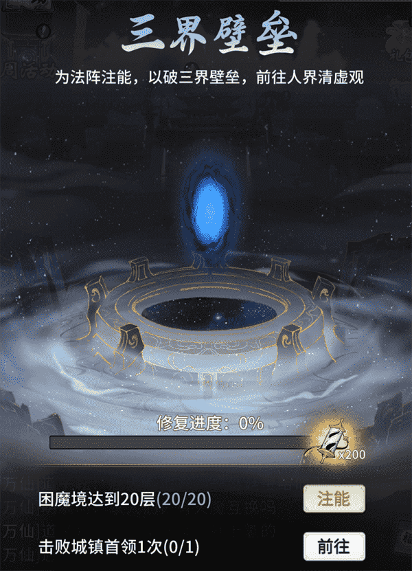 当你修为达到返虚/破虚中期后,,,可在城镇寻得芸丫并激活神秘法阵,,,,通过收集材料、、、、击败首领等方式为法阵注能,,借以打破三界壁垒,,开启支线剧情“清虚旧梦”