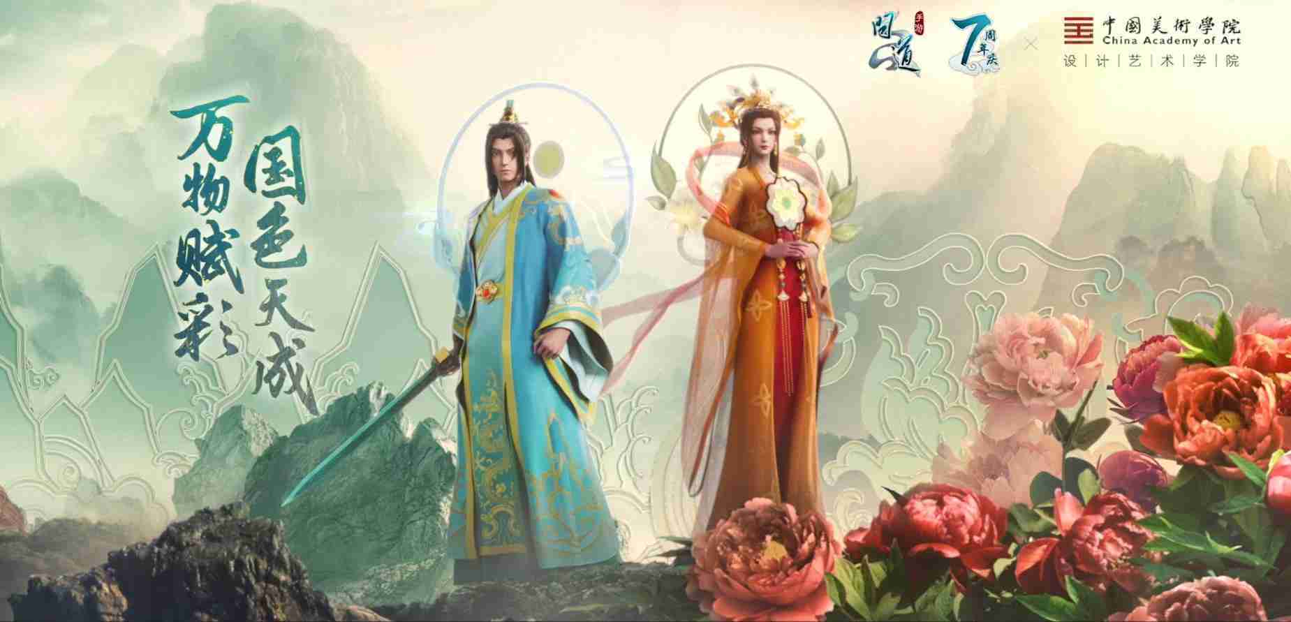 2023年4月,,,《问道手游》联动中国美术学院,,在游戏中融合了中国历史上不同时期的文化元素,,打造了“山河万象”与“凤鸣九霄”的国风时装。。。在色彩配置方面,,,,创作团队基于对游戏角色特性的分析提取相应的文化内涵,,,从每一种色彩的色相、、指代事物和情感出发对应角色属性,,,选定服装的色彩搭配。。。在纹样设计方面,,,创作团队结合游戏角色自身特殊的造型比例和形态,,,,在实际的纹样设计中进行了游戏语境下的活化演绎。。。男性角色集中使用了如蟒纹、、、、海水江崖纹、、、如意纹和云气纹等传统纹样元素,,女性角色则吸纳了凤凰纹、、、、牡丹纹、、卷草缠枝纹等元素,,组成以“双凤牡丹纹样”“缠枝牡丹纹”“金玉凤冠头饰”为主要纹样的游戏角色装饰图案系统。。