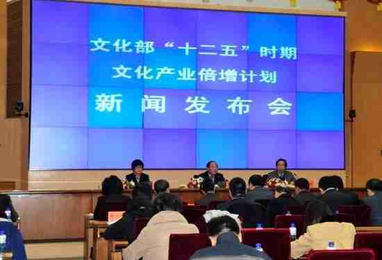 2月28日下午,,,文化部在京召开新闻发布会,,正式向社会发布《文化部“十二五”时期文化产业倍增计划》,,,提出了 “十二五”期间文化部门管理的文化产业增加值年平均现价增长速度高于20%,,,,2015年比2010年至少翻一番,,,实现倍增的奋斗目标。。
